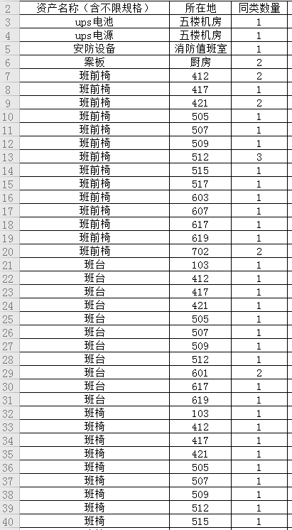 國企辦公搬遷,我公司近期將公開拍賣其擁有并存放于原辦公地點(diǎn)的辦公家具、辦公設(shè)備、安防設(shè)備、音響及音控設(shè)備、廚房設(shè)施等物資一宗,詳情請(qǐng)查看物資清單.
